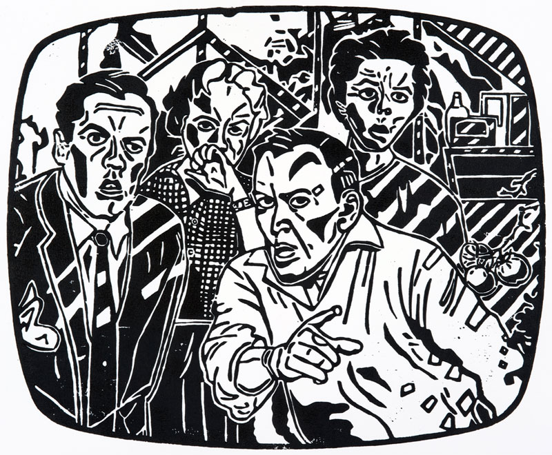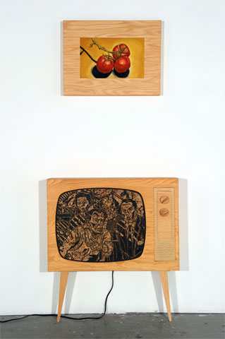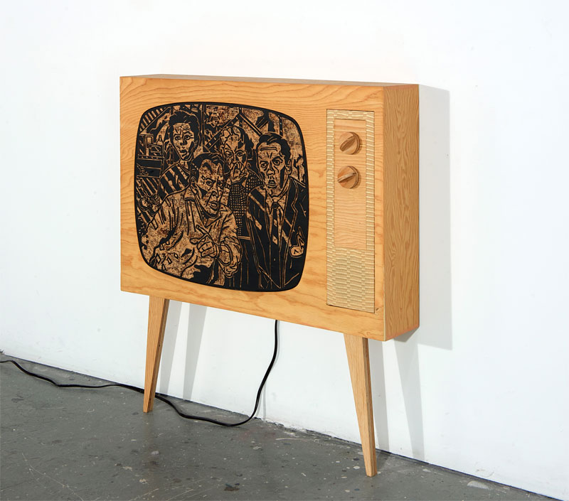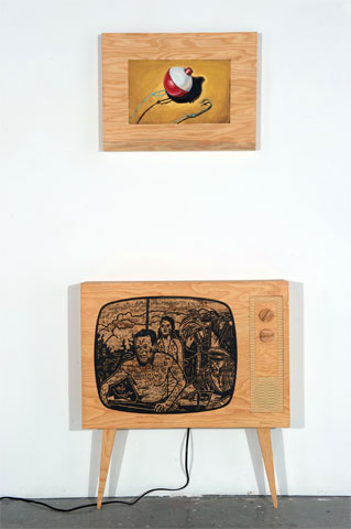 This Project will consist of a series of 12 diptych installations. Half of the installation will be a plywood TV modeled after the television I had during my youth. The screen shaped panel from the TV will be used to do a wood cut of a scene from an old Sci-Fi film. The panel will be printed then set back in the plywood TV. For the second half of the diptych, above the TV will be a painting of an object associated with my Father; a power drill, a hockey stick, a fishing lure, a TV tube, etc. These objects in a cinematic twist will be incorporated into the wood cut TV screen. The block prints taken from the woodcut panels will also be used to produce screen prints reminiscent of classic movie posters, however, skewed. Each of the TV’s will also have sound component.