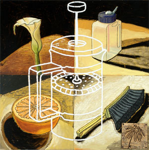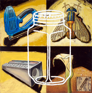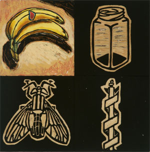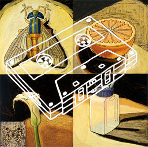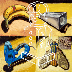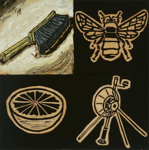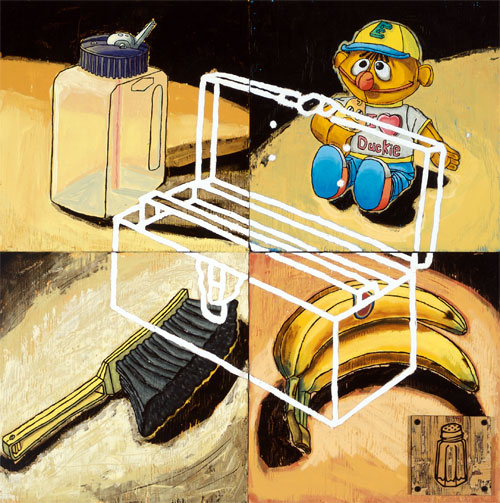 The paintings, mixed media on plywood panels, share root images from one painting to the next. This illustrates how a limited pool of resources can make up a vast number of things. It will be the arrangement and rearrangement of these images that will insure every painting has a unique conclusion.